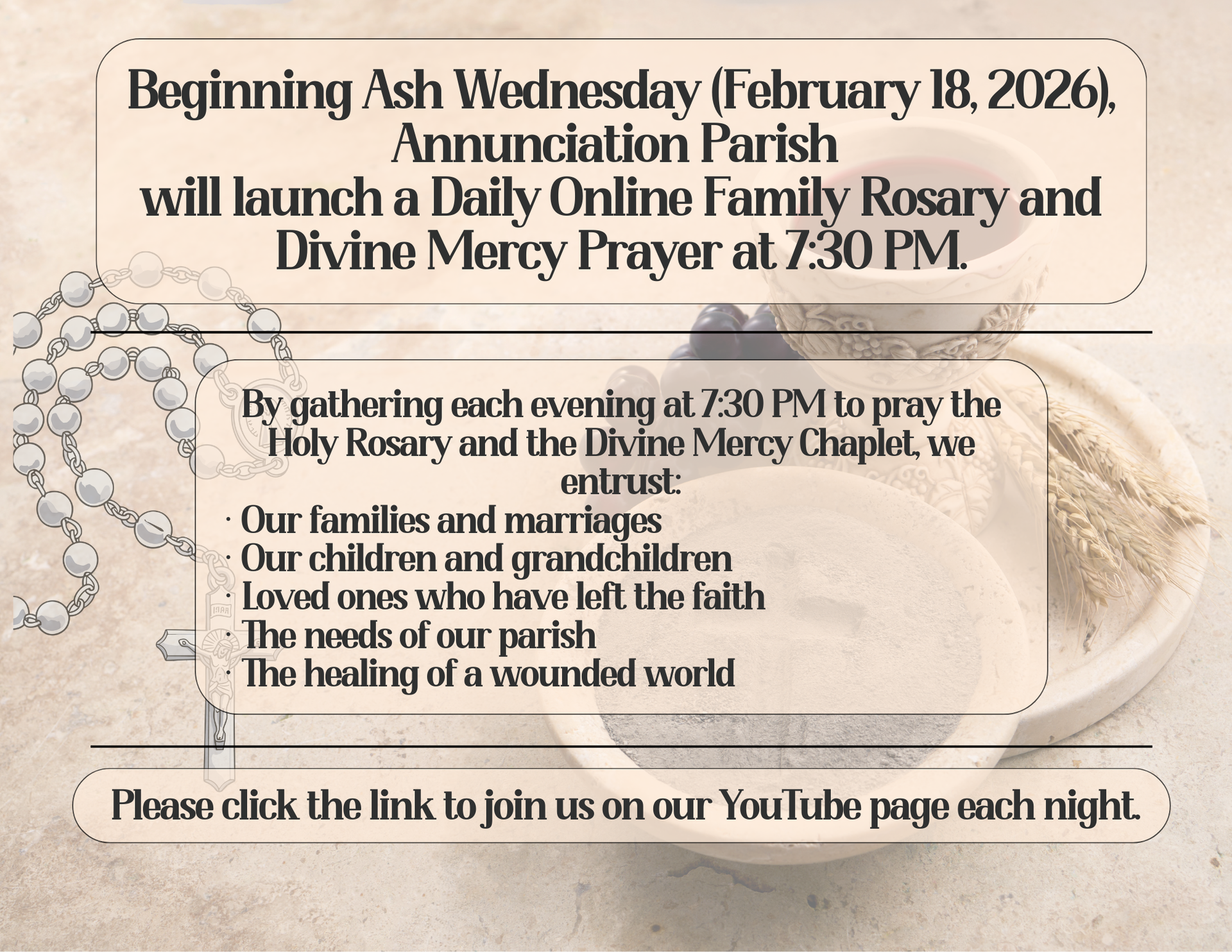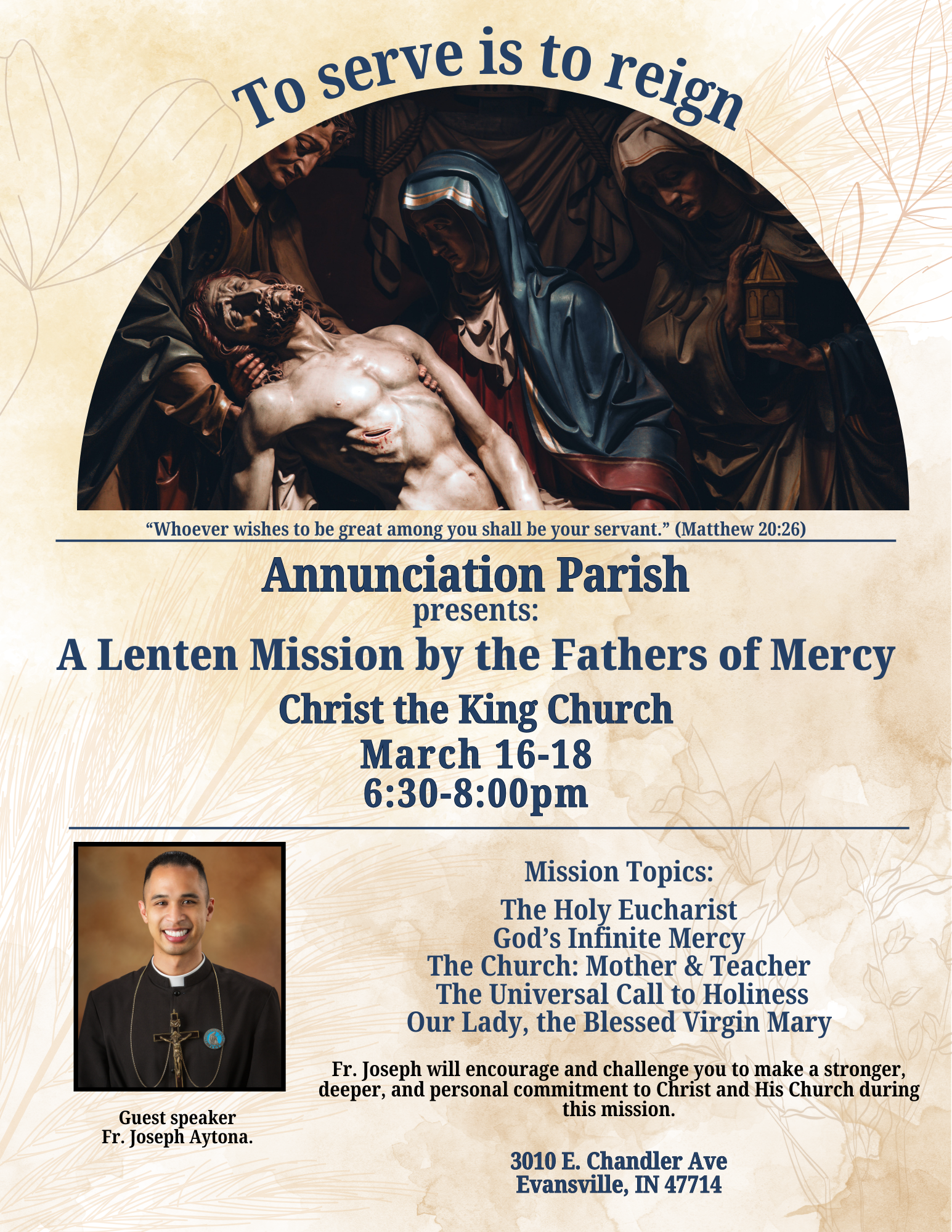 On Monday, March 2, we will have our Lenten Reconciliation Service in Christ the King gym. We begin with a light dinner at 5:00 pm, followed by a short talk by Fr. Bernie Etienne at 6:00 pm. Confessions begin at 6:30 pm with plenty of priests available. Please sign up at the back of the church or call the parish office. Please let us know if you are coming to the dinner and confessions or confessions only. See you there!